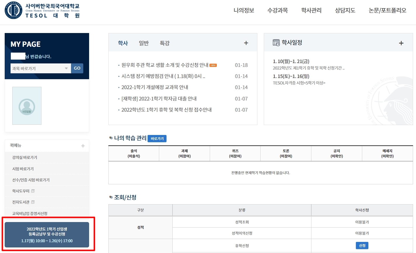 TESOL´ëÇпø 2022-1Çбâ ÇÕ°ÝÀÚ(½ÅÀÔ»ý) µî·Ï±Ý ³³ºÎ ¹× ¼ö°½Åû ¾È³»
